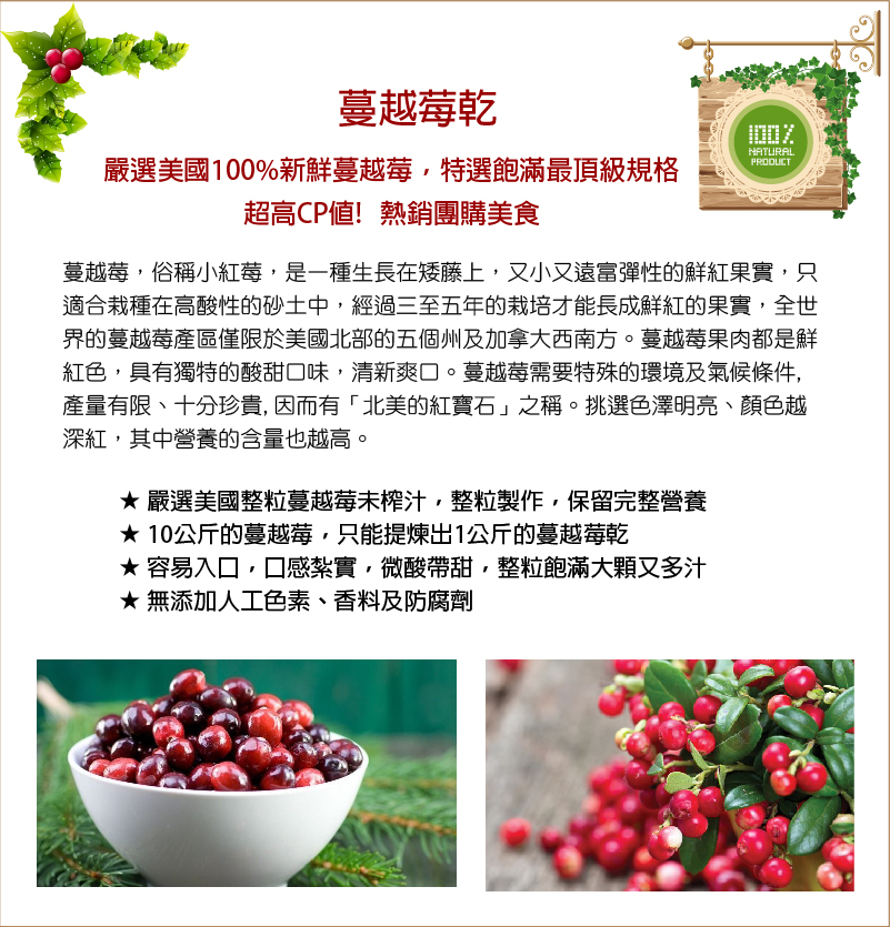 【蔓越莓乾】 美國進口特選頂級飽滿整粒蔓越莓,飽滿大顆又多汁 ,能品嘗果醬酸甜汁味。